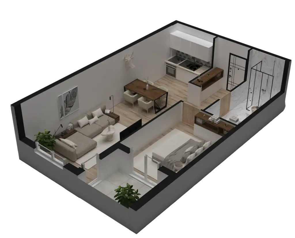 Crteži trodimenzionalnog prikaza i osnove stana su napravljeni u marketinške svrhe. Stvarne dimenzije i površine prikazanih prostorija i stana mogu varirati do 3%.